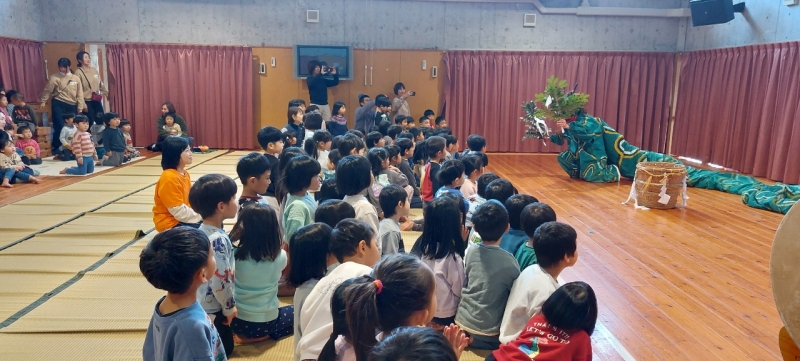 今日は、佐世神楽社中さんにお越しいただき、神楽公演をしてもらいました。今回は、かもめ保育園の4歳児5歳児のお友達も一緒に神楽鑑賞を行いました。神楽公演が始まるまでの時間では、めろん組ばなな組の子ども達は、かもめ保育園のぞう組、きりん組のお友達と自己紹介をしたり、クラスで歌っている歌を披露しあったり等ミニ交流会も楽しみましたよ。