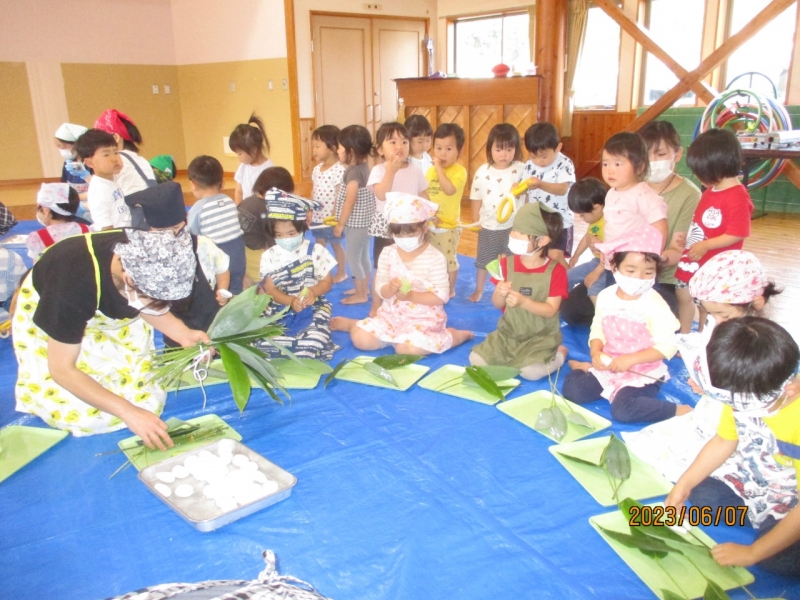 笹まきは、できてすぐと午後のおやつの時間においしくいただきました。笹の葉を団子から外すことも面白く、「バナナ(の皮むき)みたい」と言っている子もいましたよ。楽しい美味しい時間を過ごす事が出来ました。地域の伝統的な食べ物として、笹まきづくりをする経験をこれからも大切にしていきたいです。