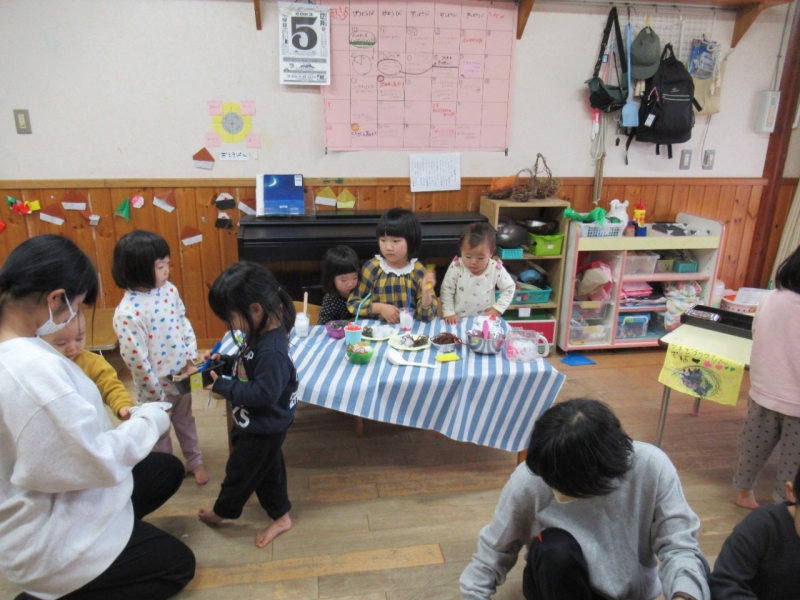 冬のコンサートが終わった後は「おまつり始まるよ~!」の声で、5歳児のおまつり屋さんが始まりました。ずっと子ども達が楽しんでいたおまつりごっこ。“かもめ保育園のみんなを招待したい!”という思いから、コンサート後に合わせて開店できるように準備していました。
